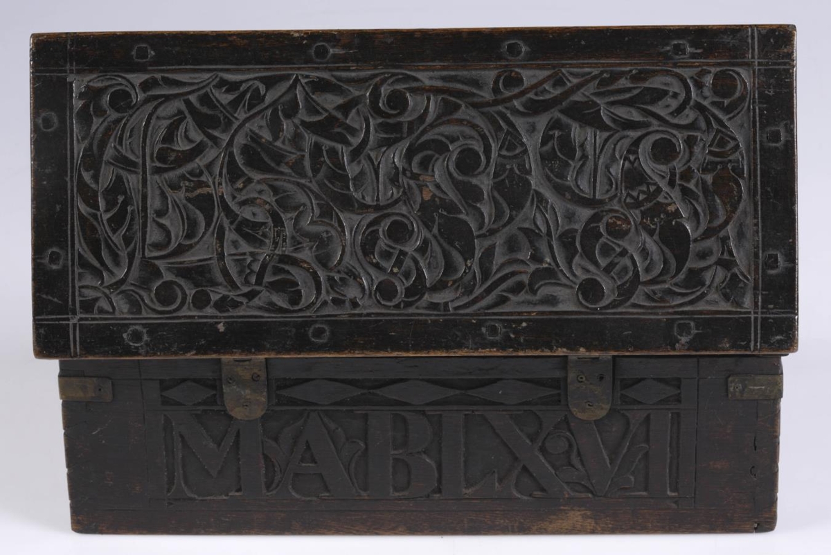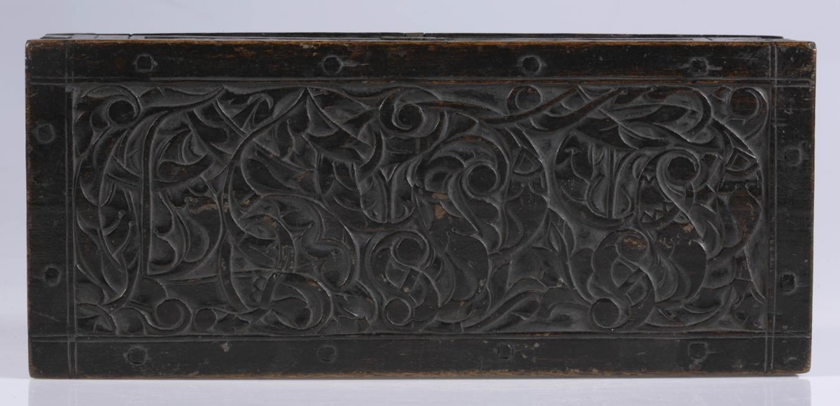 ofan á lokinu eru afar skrautlega skornir með eins konar gotnesku letri,