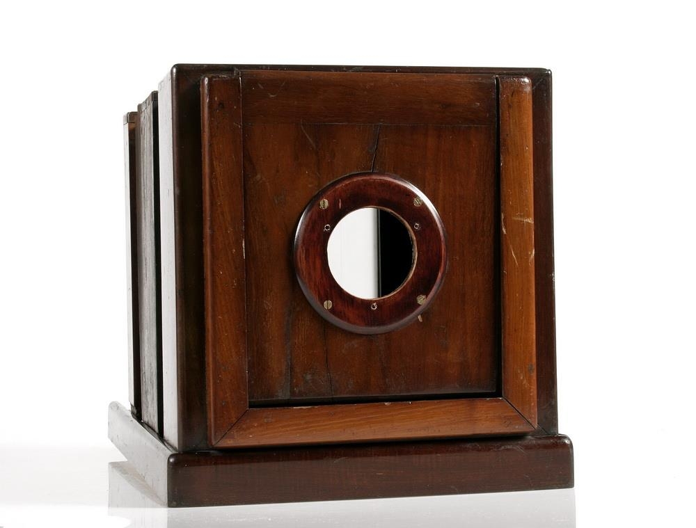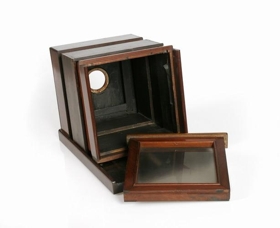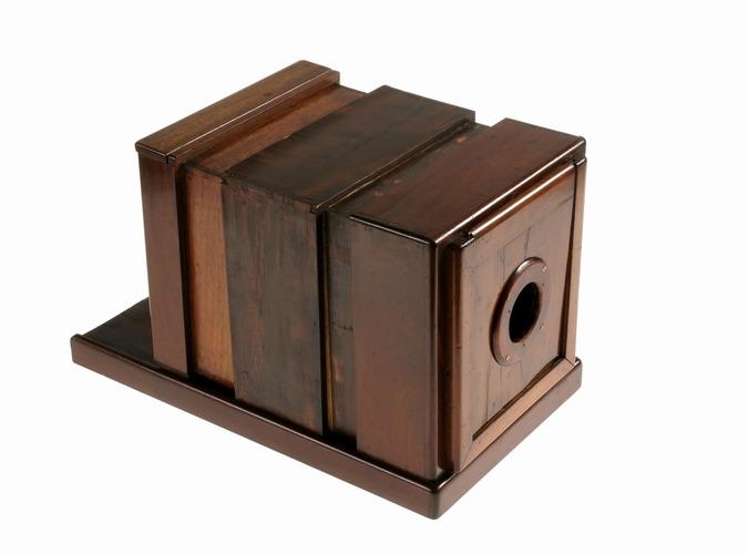 Kassamyndavél frá síðari hluta 19.aldar. Vantar linsuna. Kassinn stendur á undirstöðu sem er að hluta til auð. Þar er skrúfa sem notuð er þegar vélin er fest á þrífót. Þar sem ljósmyndari horfir í vélina er rammi með gleri en á honum má sjá ýmis stærðarform fyrir mótífið. Einnig fylgir plötuhaldari sjá 1981:95. Ath. að tréhringurinn á plötunni þar sem linsan er sett á er ekki upprunalegur. Hann var settur til að linsa úr vél Jóns frá Ljárskógum var nothæf í þessa vél. Þetta var gert í sambandi við sýningu á TH-myndum 1982-1983.