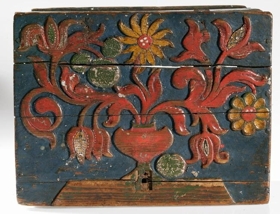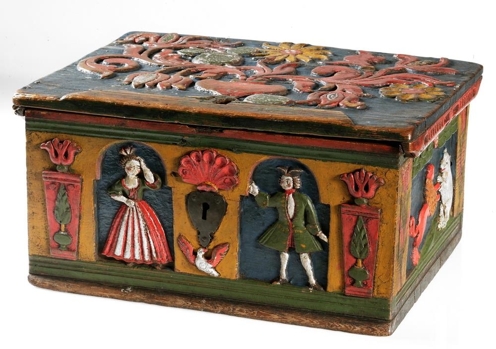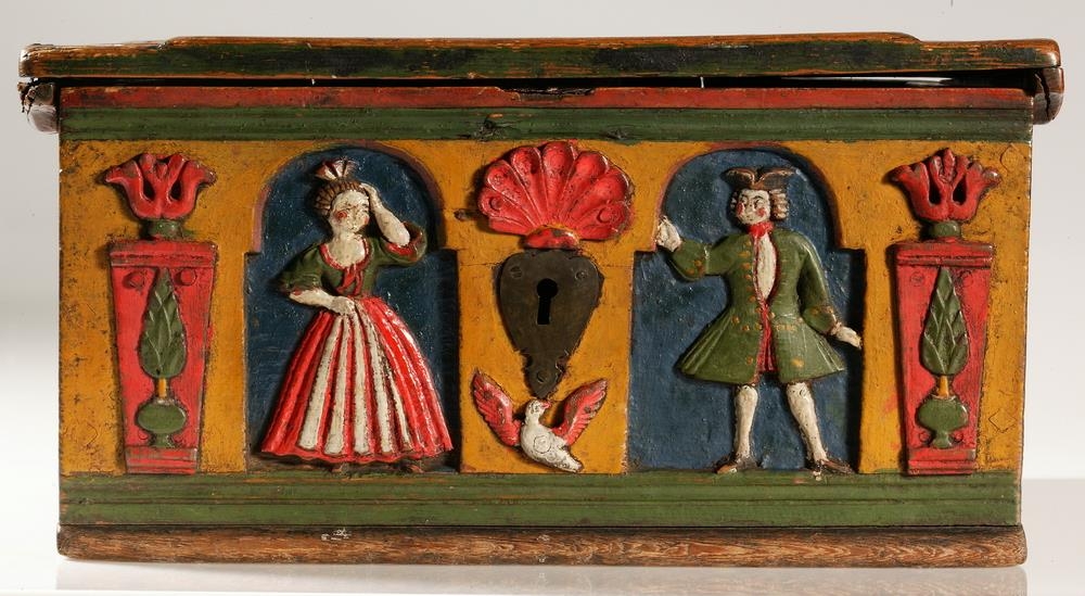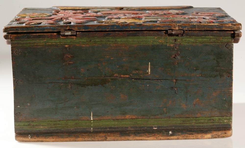 málaðr rauðr, grænn, gulur, blár, og hvítr. Á lokinu er mjög stórgerð blómstra