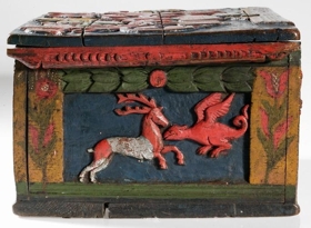 og 15½ á breidd, hann er allr útskorinn með rósum, mannamyndum og dýra, hann er