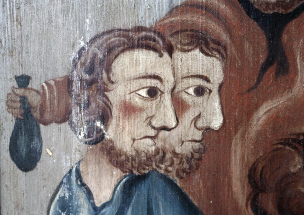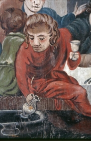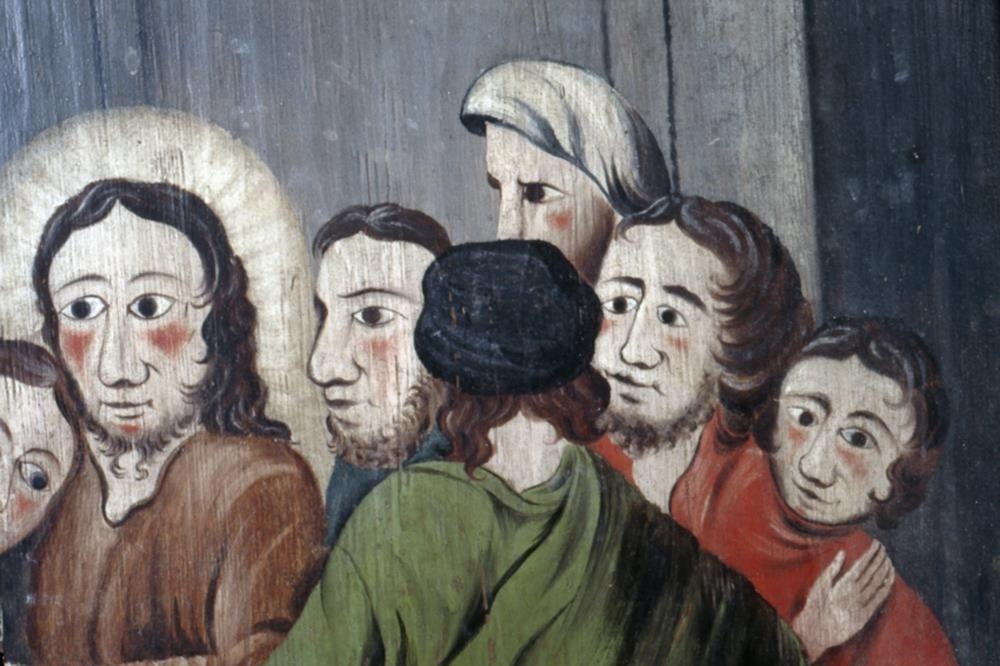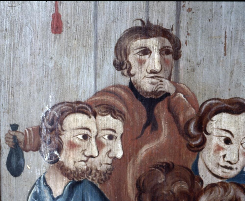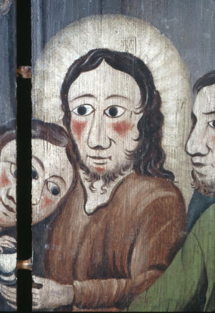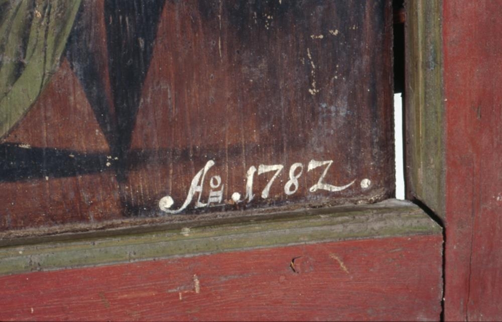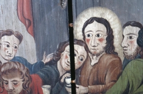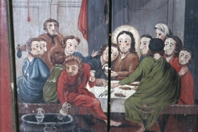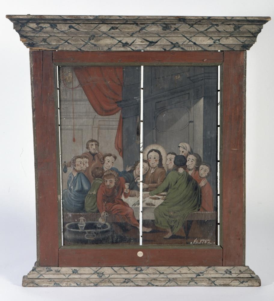 Altaristafla, kvöldmáltíðin máluð á trjespjald, fremur illa: ártal : 1782, á spjaldinu: það er í rauðmálaðri umgjörð: stallur undir og brún yfir með einskonar marmaramálningu. Frá Holti í Fljótum.