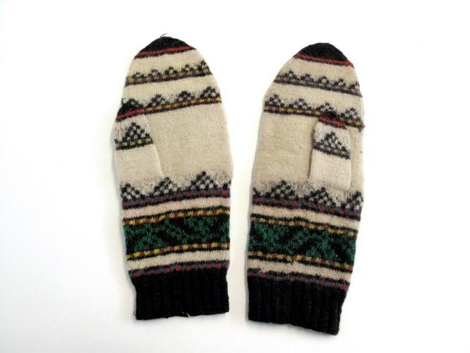 tvíþumlaðir, s..ki (?) laufaviðarvettlingar, prjónaðir úr hvítu bandi með