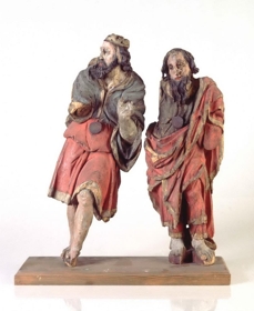 Mynd af óþekktum helgum manni, skorin í eik; hann er berhöfðaður, með sítt hrokkið hár og lángt skegg, í síðum kyrtli heilum á brjóstinu með víðri höfuðsmátt, með gylltu hlaði kríngum. Kyrtillinn er að neðan klofinn á vinstri hlið upp á mitt lær, og er gylltur knappur efst í klaufinni, og gyllt hlað virðist að hafa verið allt í kríng á kyrtlinum að neðan og upp með klaufinni; á fótunum ber hann víðar ökulbrækur, sem ná niður á mjóalegg, með gylltu hlaði að neðan, þær eru styttar upp um miðjan kálfann með bandi, sem bundið er utan um þær; hann er berfættur; yzt ber hann stóra og víða kápu (toga); á seinni tímum hafa þessar myndir verið mjög illa málaðar með olíulit, og er því mjög örðugt að sjá, hver litur hafi verið á klæðunum upphaflega, þó held eg helzt hann hafi verið enginn annar en sjálfur eikarliturinn, nema gyllíngin á hlöðunum. Báðar myndirnar eru stórum brotnar. Þær eru báðar úr Landakirkju í Vestmannaeyjum, sjálfsagt frá katólska tímabilinu.