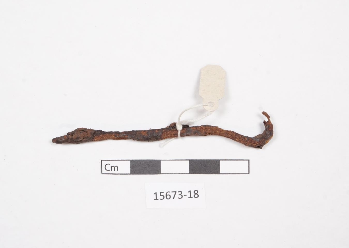 18. Járnteinn, grannur, flatur og með krók á enda, l. 7.2 og þvm. 0.7 sm. Ryðétinn.