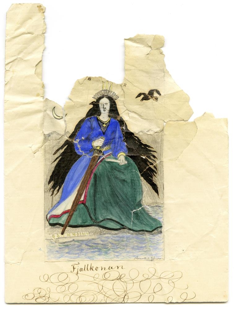 Fjallkonumynd eftir Sigurð Jónsson sýslumann. Myndin er teiknuð með blýanti á venjulegan, hvítan skrifpappír og lituð með vatnslitum. Stærð 13x8 sm. Hún er fremur illa farin, og efri hlutinn er í tætlum. Landsbókasafnið (Guðbrandur Jónsson afh.).