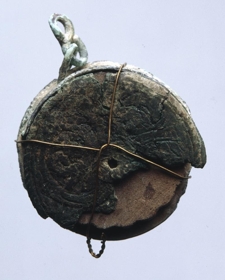 Kinga úr látúni, mjög eydd orðin og vantar mikið af annari plötunni: hefir hún verið með rós grafinni á, en á hinni heilu er ihs (þ.e. Jesús). Þvermál 3,5 cm.: þyktin hefir verið um 0,7 cm.: er að eins þriðjungur millihringsins eftir og hefir verið fest í hann keðju: hlekkirnir eru eins og 8 í lögun. Smáprjónn úr látúni fylgir, fanst með : hefir hann máske verið til þess að festa á sig kingunni einhvern veginn. Varla yngri en frá 15. öld. Fanst í jörðu á Langárfossi árið 1909. Sbr. ennfremur nr. 230, 247, 315, 994, 4135. Kingurnar voru skrautgripir, en jafnframt verndargripir, af því er markað var á þær.