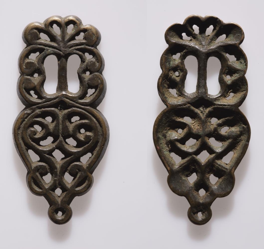 á lengd: það er steypt úr kopar og gagnskorið með leggja - og bugarós: