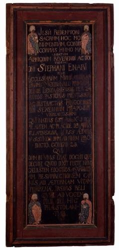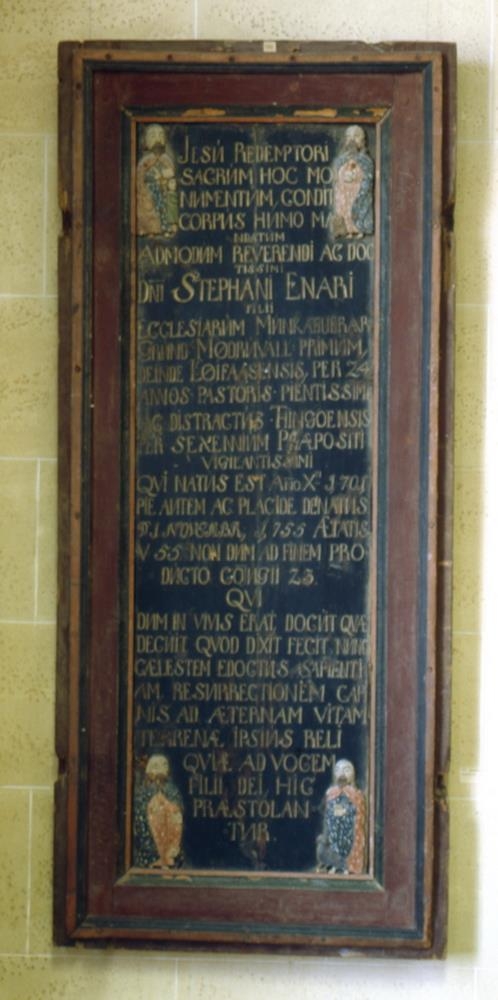 Memorial plaque to the Rev. Stefán Einarsson of Laufás, 1698–1754 AD. The Latin epitaph briefly recounts Stefán’s career. In the corners are the Evangelists with their emblems. The plaque is probably the work of