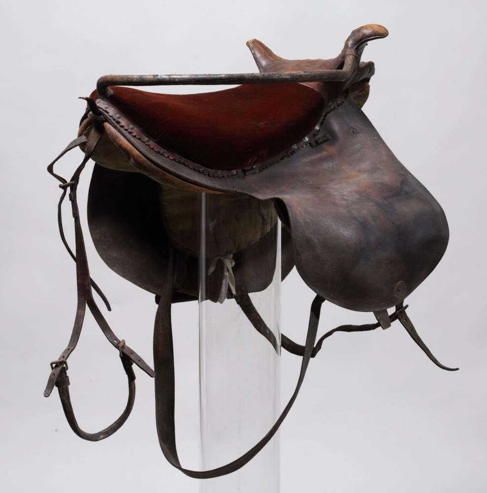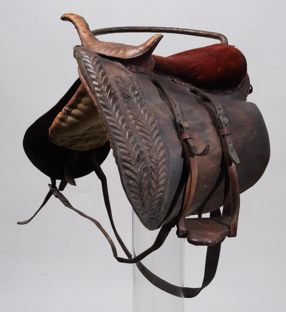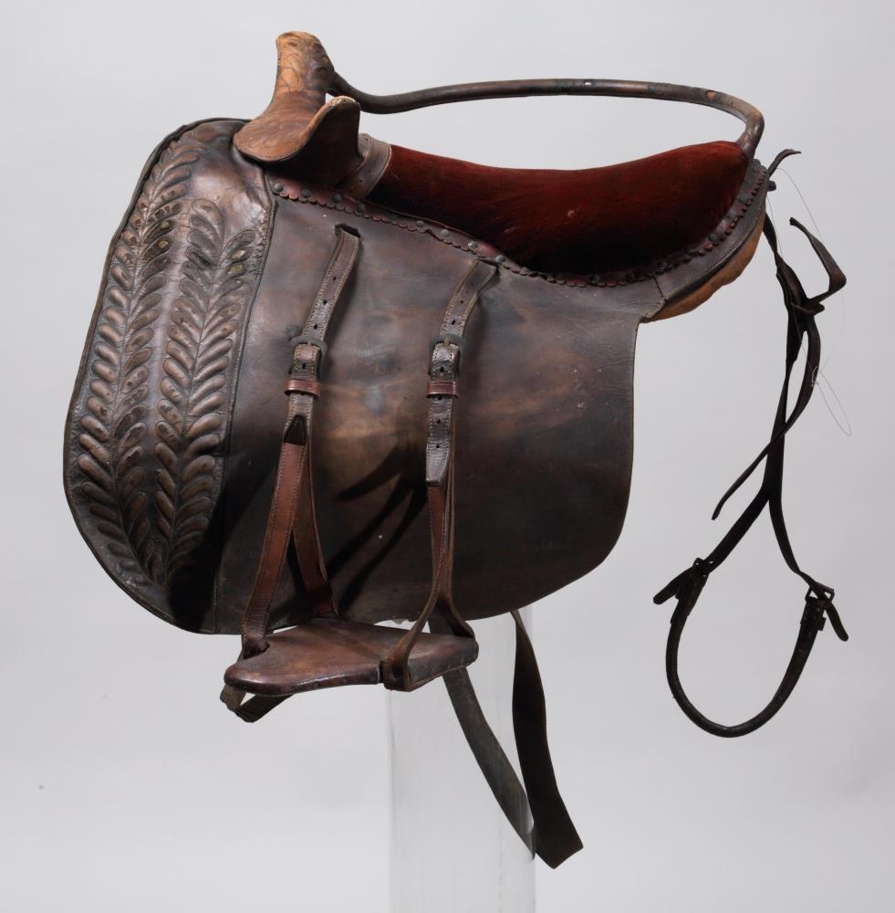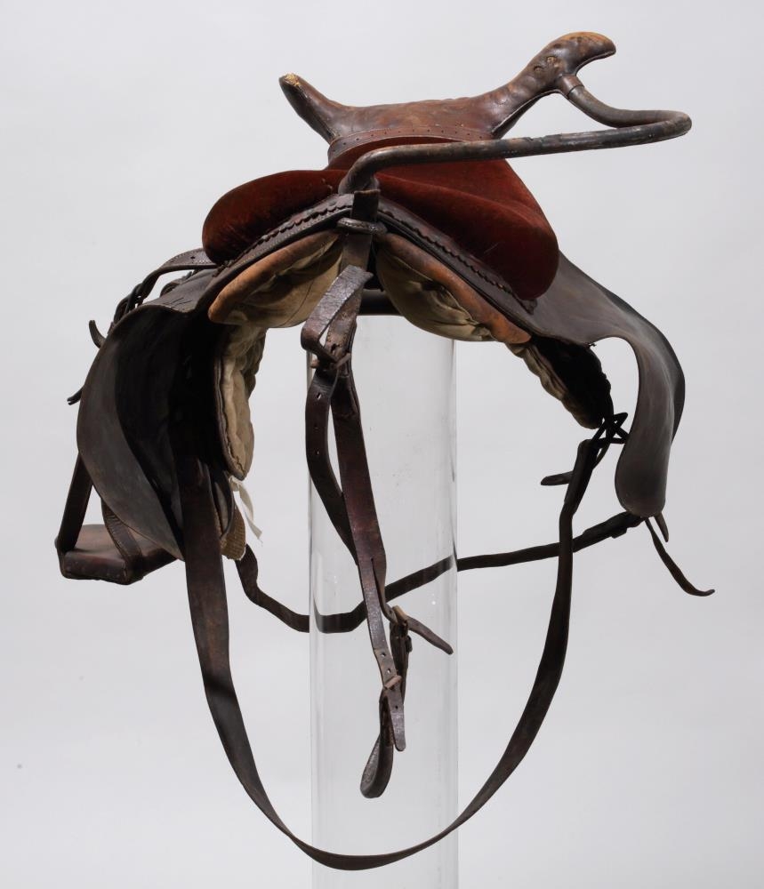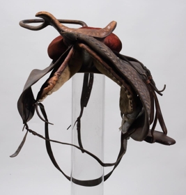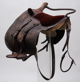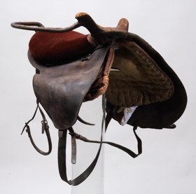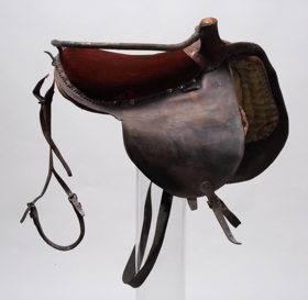 Söðull með sveif og klakki (klakksöðull), enska lagið, nýlegur. Setan er úr rauðu flosi, en haus og klakkur er klætt leðri, skrautsaumuðu: sömuleiðis er frambrún framhafsins skrautsaumuð, og myndar það skrautverk líkt og fléttinga. Í löfunum er sérstök gjörð úr leðri, en aðalgjörðin er brugðin, með koparhringjum ósamstæðum. - Átt hefir móðir gefanda, Jóhanna Sveinbjarnardóttir frá Ási í Hrunamannahreppi.