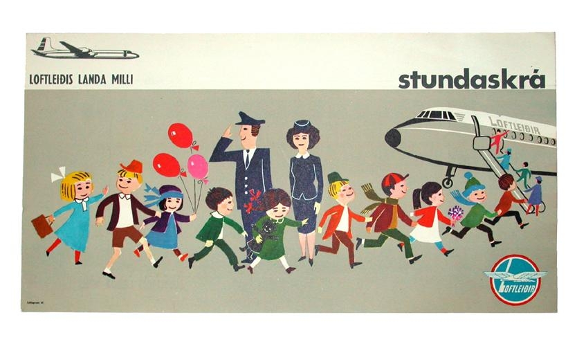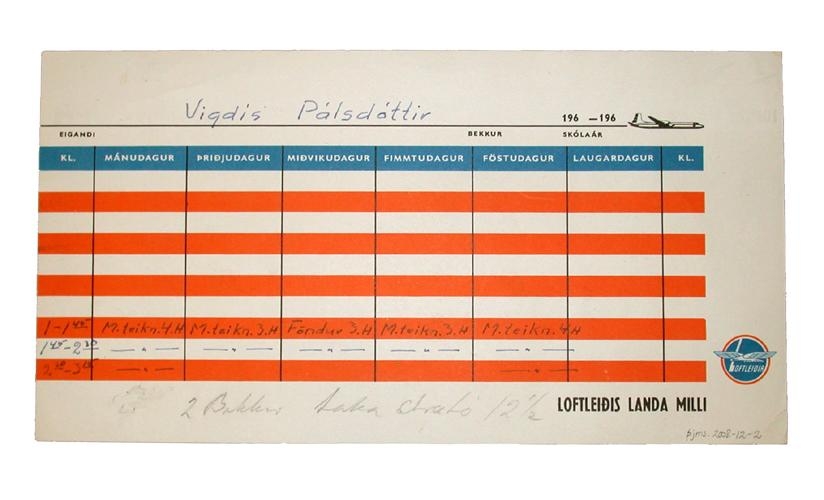 útgefin af Loftleiðum. Stundaskráin er merkt gefanda, Vigdísi Pálsdóttur,