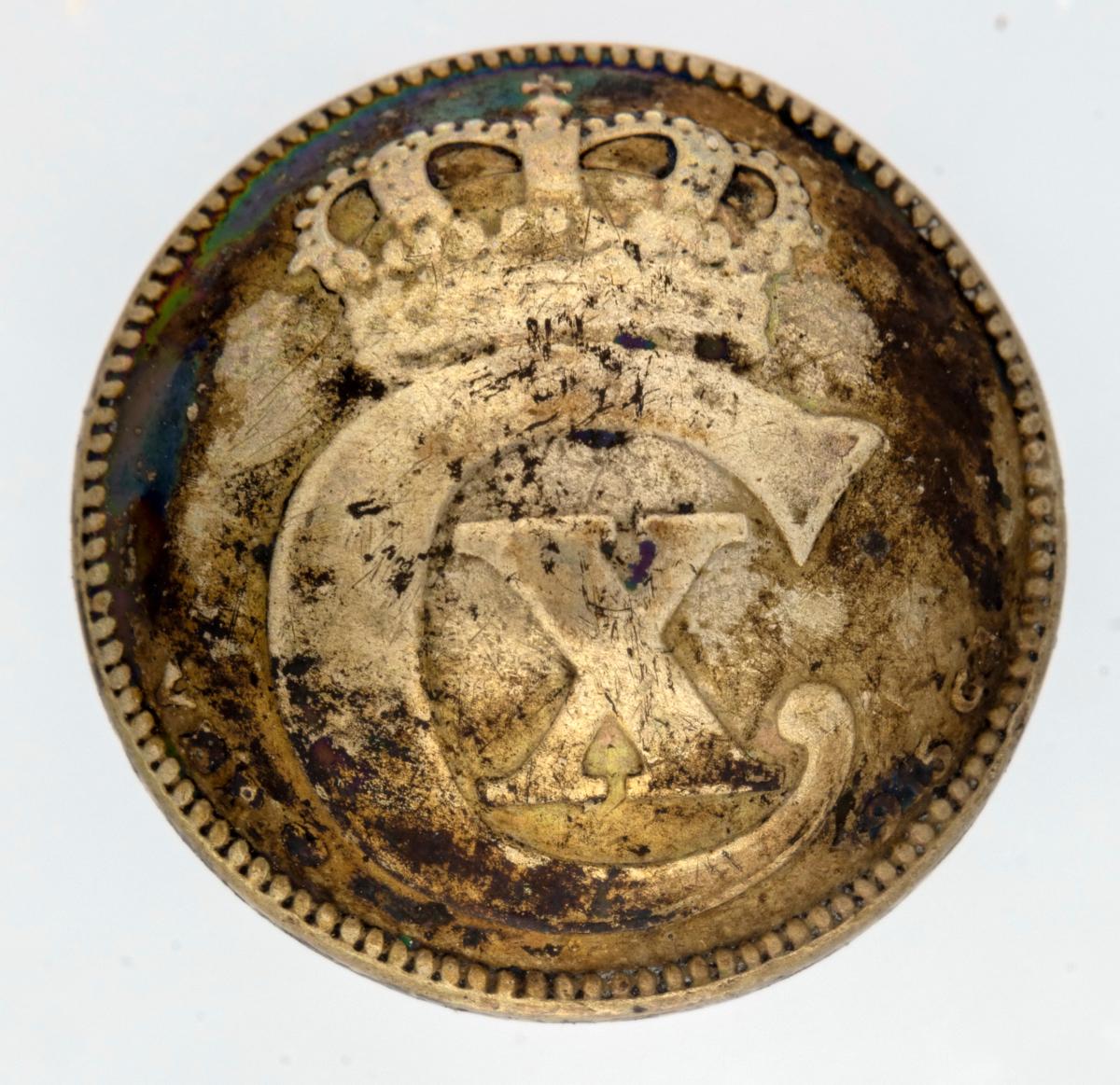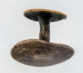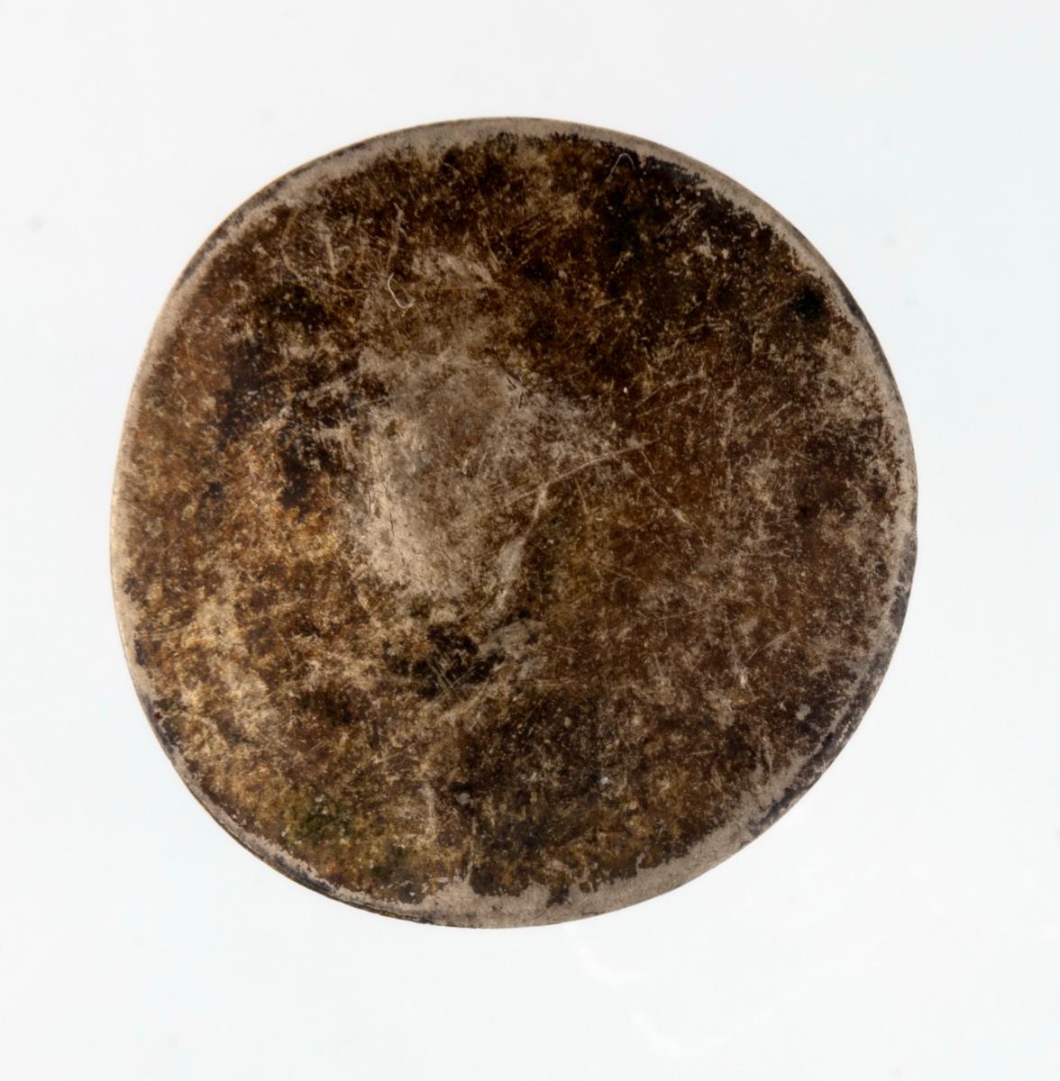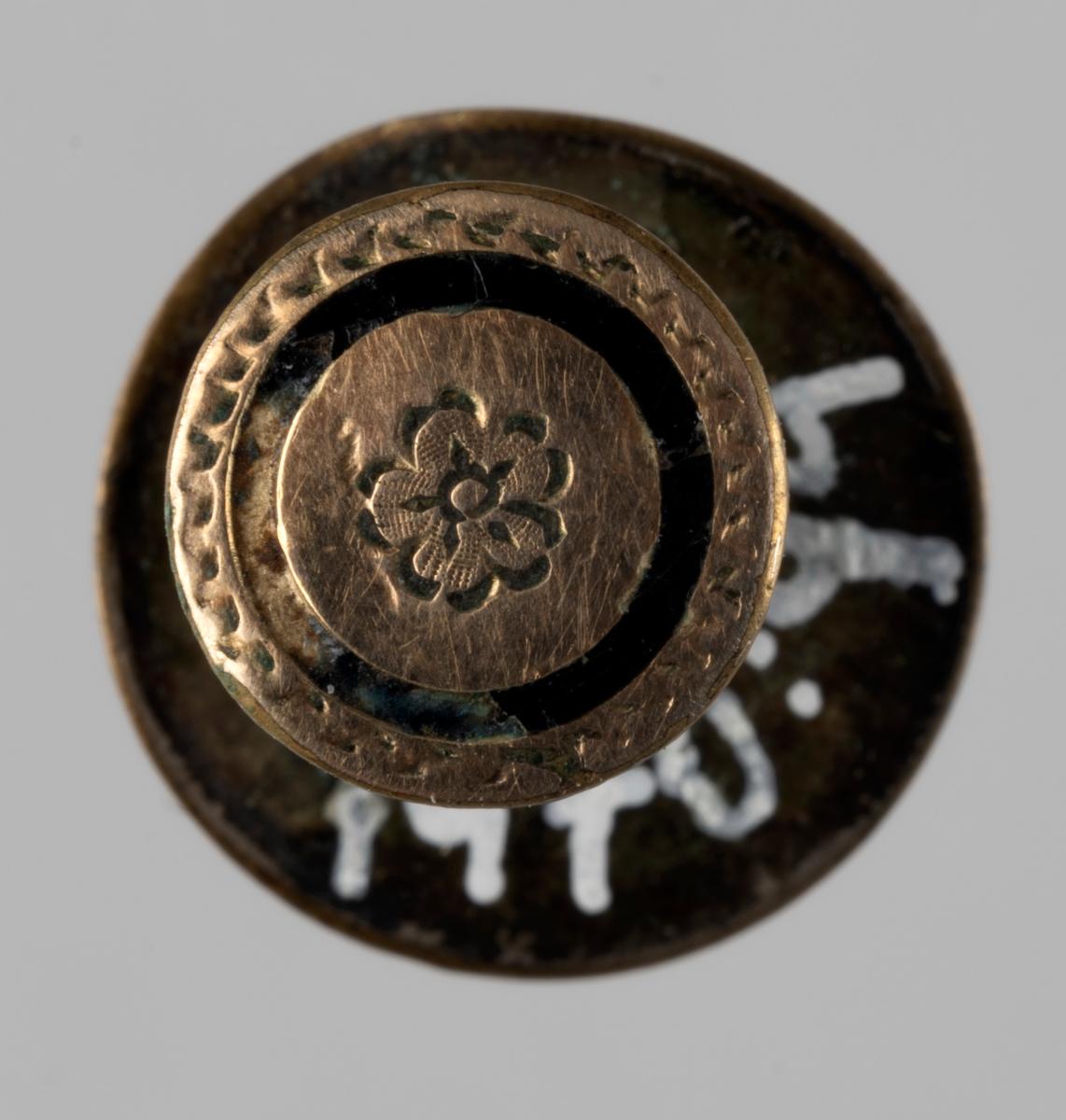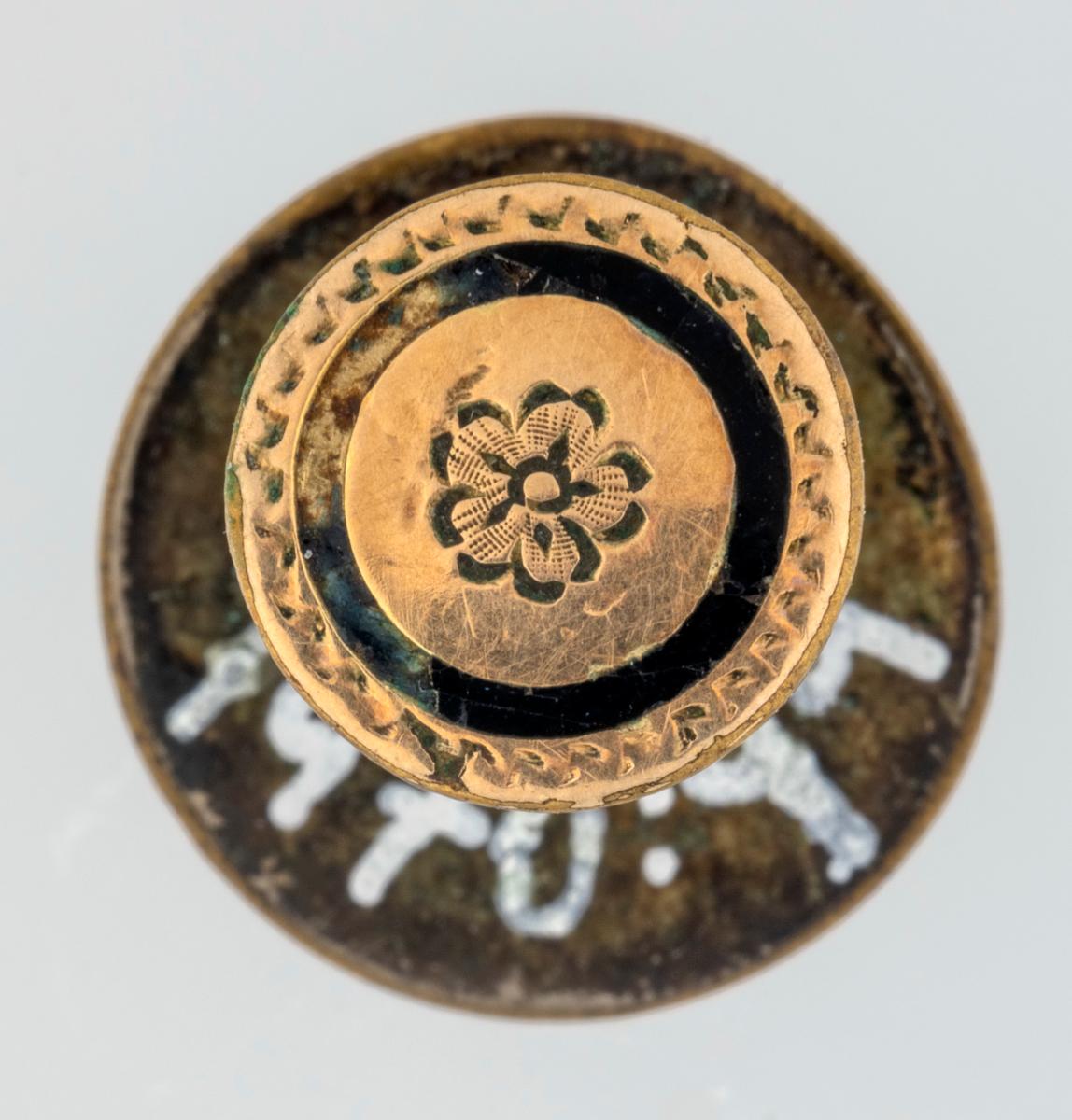 Brjósthnappur, mynstur að ofan: blóm og umgjörð. Hnappurinn sjálfur líklega úr gulli en fóturinn og platan undir líklega úr silfri. Talið úr búi Þuríðar Lange.