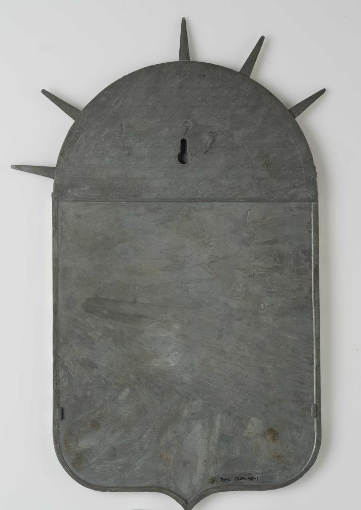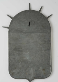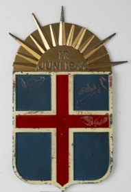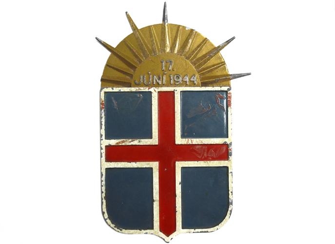 Skjöldur, steyptur úr sinki eða sinkblöndu, sem sýnir íslenska fánann og fyrir ofan hann bronslitaða sólaruppkomu (rísandi sól) og sólargeisla. Á sólinni stendur, upphleyptum stöfum: 17. JÚNÍ 1944 (samskonar og lýðveldismerkið sem gefið var út fyrir lýðveldishátíðina 1944). Endar tveggja sólargeislanna eru brotnir af. Árið 1991 keyptu gefandi og eiginmaður hennar húseign að Kirkjuteigi 31 í Reykjavík. Þá var skjöldurinn í bílskúrnum sem fylgdi húsinu. Að sögn gefanda voru geislarnir tveir á skildinum þá þegar brotnir. Georg Ámundason heildsali (f. 11.2.1917, d. 20.12.2007) bjó áður í húsinu og byggði það. Skjöldurinn hékk síðar á vegg á heimili gefanda. Eins og fyrr segir eru endar tveggja geislanna brotnir af skildinum. Málning er nokkuð víða rispuð og flögnuð af en annars er skjöldurinn í góðu ástandi.