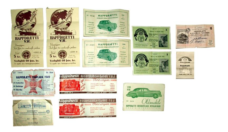 13 happdrættismiðar frá ýmsum félögum frá árunum 1939 - 1950.