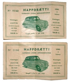 - Tveir samskonar happdrættismiðar frá HAPPDRÆTTI SAMBANDS UNGRA JAFNAÐARMANNA, frá árinu 1950, hvítir, grænir og brúnir að lit.