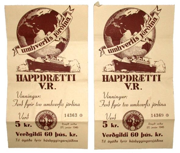 - Tveir samskonar happdrættismiðar frá HAPPDRÆTTI V.R. frá árinu 1945, í ljós- og dökkbrúnum lit.