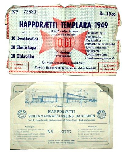 - Happdrættismiði frá HAPPDRÆTTI TEMPLARA, frá árinu 1949, hvítur, blár og rauður að lit.