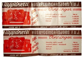 - Tveir samskonar happdrættismiðar frá HAPPDRÆTTI HÚSBYGGINGARSJÓÐS F.U.J., frá árinu 1948, hvítir, rauðir og brúnir að lit.