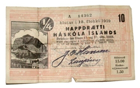 - Happdrættismiði frá HAPPDRÆTTI HÁSKÓLA ÍSLANDS, frá árinu 1939, hvítur, bleikur og svartur að lit.