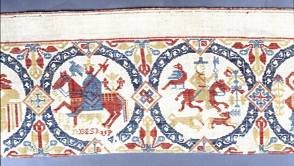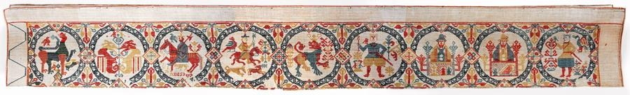 Rekkjurefill úr hvítu hörljerepti, l. 380, br. 51 cm. Allur útsaumaður með refilsaum, 9 hringar bláir með myndum innaní, sem eru með ýmsum, rauðum, ljósbláum og grænleitum: hringarnir eru skeyttir saman með rauðum ferhyrningum með ýmsu skrauti innaní, og fyrir utan þá eru á milli hringanna greinar með blöðum, alt með margvíslega litu, íslenzku ullarbandi. Fyir ofan hringana og við báða enda eru auðir bekkir og hefur að líkindum átt að sauma þar á letur. - Innaní 1. hring er dýr (ljón?)., fuglar og hundur á hlaupum, líklega veiðimynd: í 2. hring 2 drekar er snúa saman og er trje á milli: í 3. ríðandi maður með öxi reidda um öxl, hauk á makka hestsins og hund undir kviði, en letrað er hjá með rómönskum upphafsstöfum: TIR (?) K(?)INNBISKUP: er 3. og 4. stafur vafasamur og víst hver þessi byskup er: máske hefur hjer orðið misskilningur og villa, og hjer hafi átt að standa UILKINN. Ekki er maður þessi í byskupabúningi að neinu leyti. Í 4. hring er veiðimynd, ríðandi maður og er haukur á lend hestsins, en hundur eltir hjört framhjá manninum: trje er fyrir framan þá Í 5. hring er kórónað ljón, trje fyrir framan og aptan: það stendur og horfir aptur fyrir sig. Í 6. hring er standandi maður með kórónu á höfði, með veldisspíru í hægri hendi og sverð við hlið í vinstri: haukur á hægri öxl. Treyjan blá, stutt og nærskorin buxur á hnje niður, afarvíðar, grænleitar: sokkar rauðir. Trje eru hjá. Lík mynd er í 9. hring, en í 7. og 8. hring eru myndir sem líkjast einnig hvor annari, sitjandi maður við borð, sem virðist dúkað og með konnum á: hann er með hatt mikinn á höfði. Myndirnar sýnast eptir búningunum að dæma vera frá 16. öldinni, en refillinn er að líkindum ekki eldri en frá 18. öld.