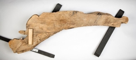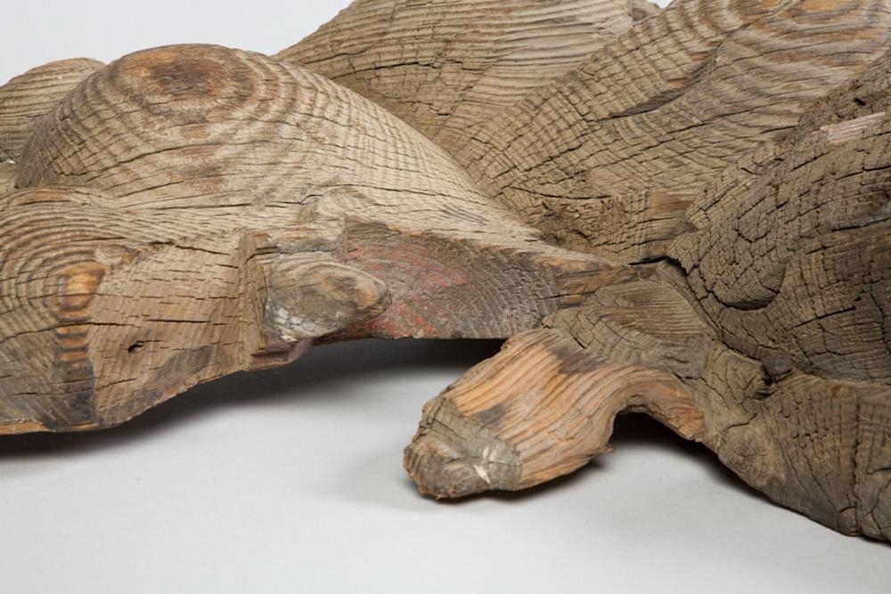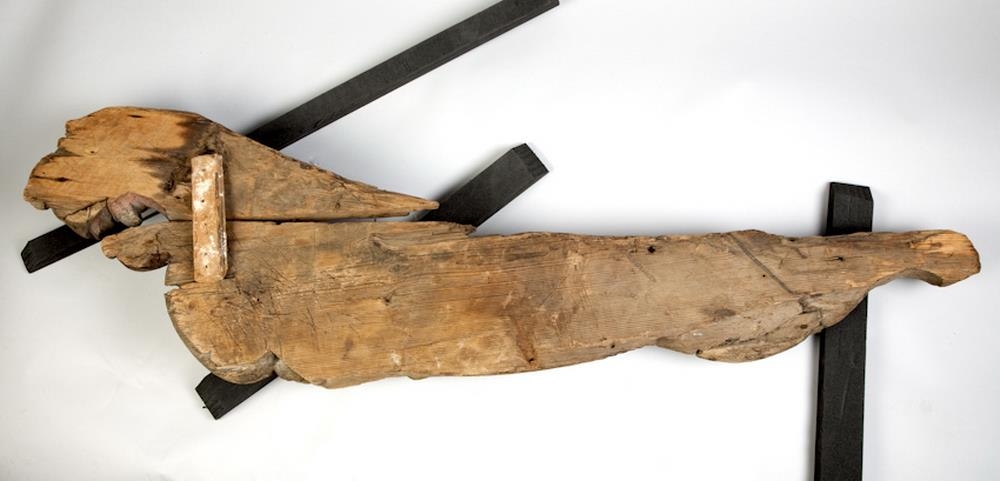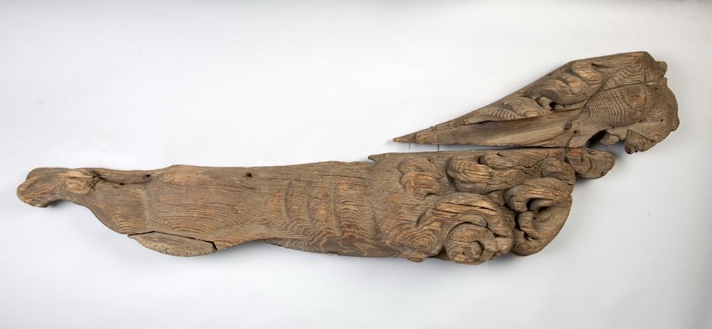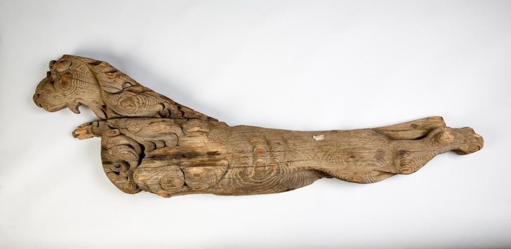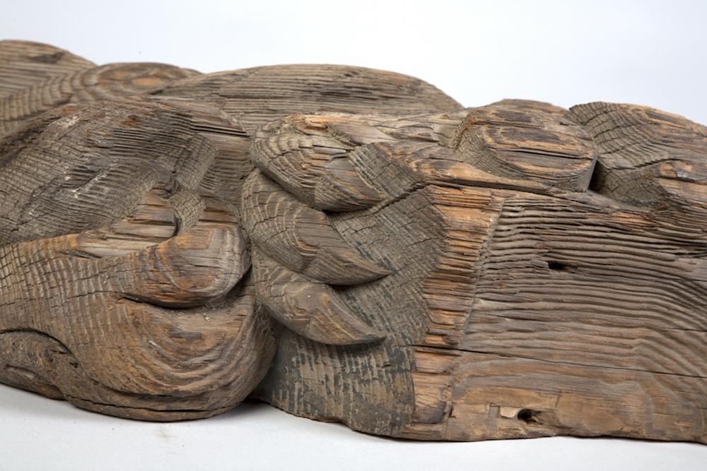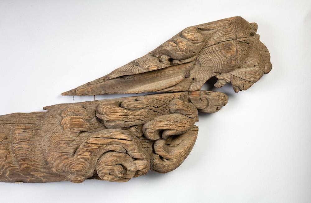 „Þessar tvær skurðmyndir virðast vera skjaldberar, en það sést í "scroll-ear" topp á skildi sem ljónin halda í. Annaðhvort var þetta hússkreyting, eða skipsmynd. Ef þetta er skipsmynd, þá væru ljónin sitthvoru megin við stafnið, og skjöldurinn væri fremst.“ (GThE 2025)