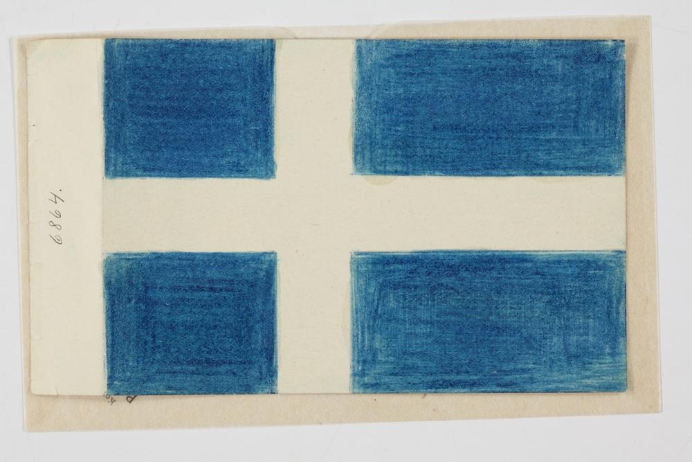 Fánamynd úr pappír, frummynd af fána fyrir Ísland, krossfáni, reitir bláir, kross hvítur: l. 14,2, br. 9,6 sm. Stangarreitir 4,7 x 3,8 sm: breidd krossins 2 sm.