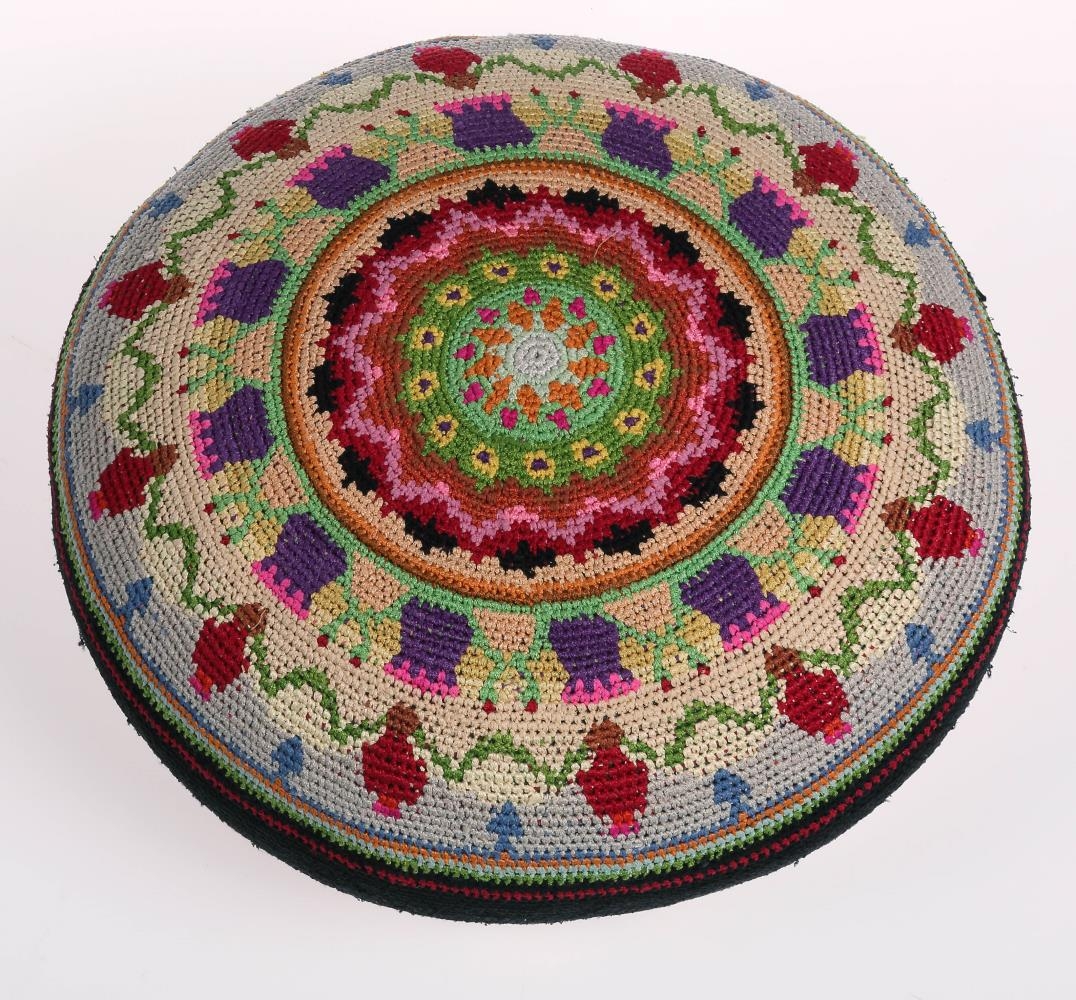 Marglitur uppsettur púði. Þorbjörg Árnadóttir M.S. frá Skútustöðum afhenti hluti 1966:1, 2 og 3, sem Helga Baldvinsdóttir (Undína skáldkona) vann úr niðurklipptum silkisokkum, er hún litaði og heklaði úr á eftir. Munirnir trúlega gerði á árunum 1930-1940. Doktor Jón S. Árnason, Seattle, bróðir Þorbjargar sendi munina til Íslands. Þeir eru úr búi frú Sophie Kyle, Paulsbo Washington, en bróðir frú Sophie, Walter, mun hafa ráðið heimsendingu þeirra, sjá ennfremur aðfangabók 25.02.1964.