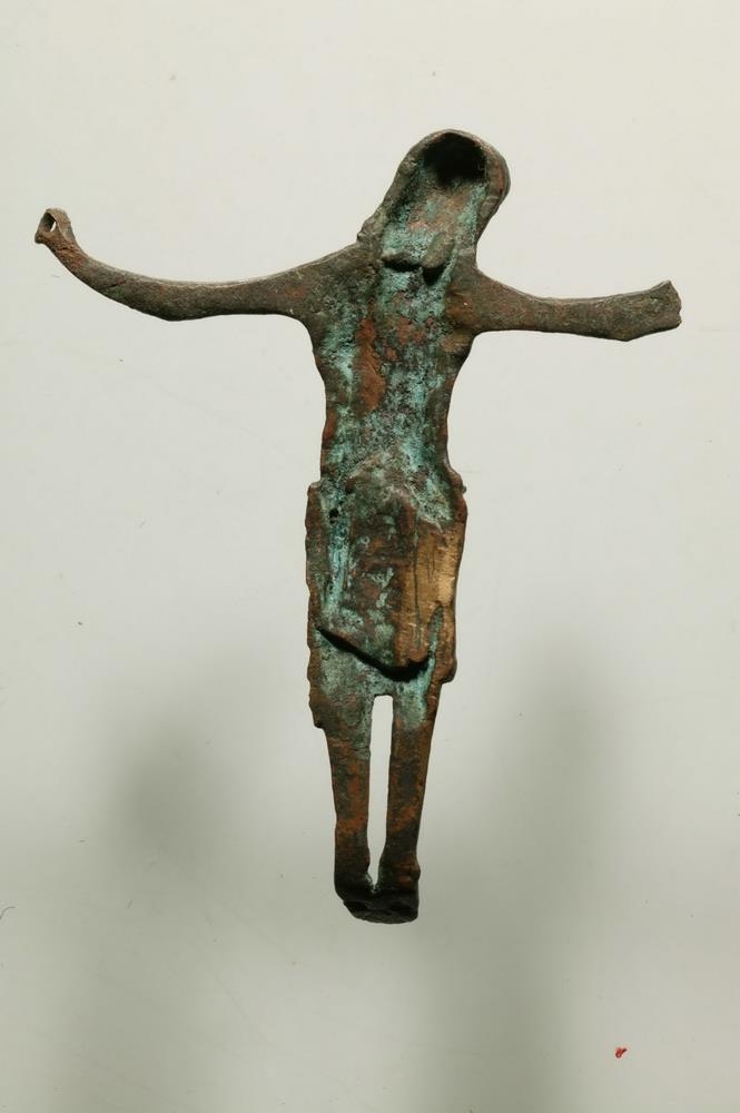 Krossmark úr bronzi. Það hefir verið málað. Um miðjuna er breiddur breiður dúkur, og fæturnir eru samsíða, en eigi krosslagðir, og bendir það meðal annars á, að það sé gamalt, líklega frá þrettándu öld. Krossmark mjög líkt þessu fannst í Hróarskeldu dómkirkju með letri á, sem mest tíðkaðist í Danmörku á tólftu og þrettándu öld, og sem er einnig á nr. 247 hér á eptir, er eg hygg að sé frá því tímabili, og sama er að segja um nr. 164 og 198. Krossmarkið fannst í Bygðarholti á Breiðumýri í Flóa.