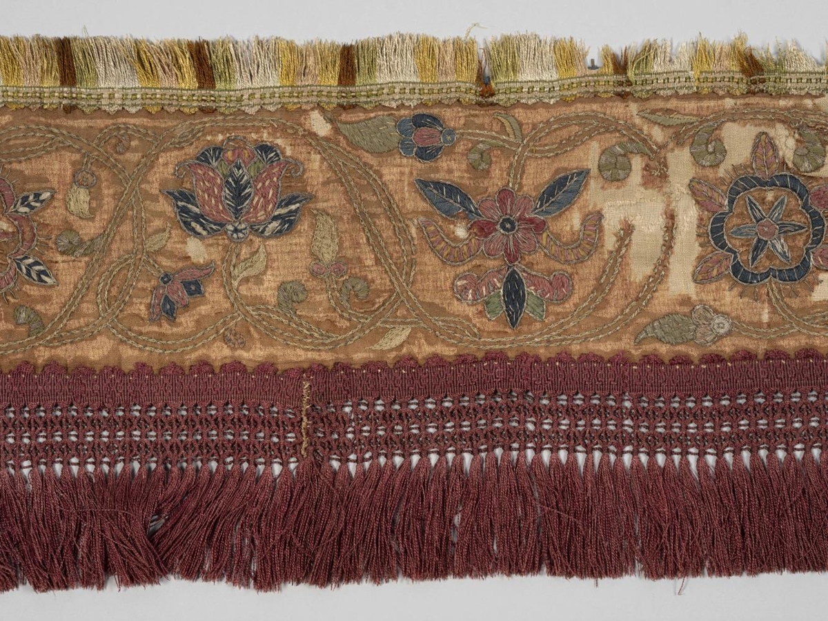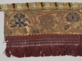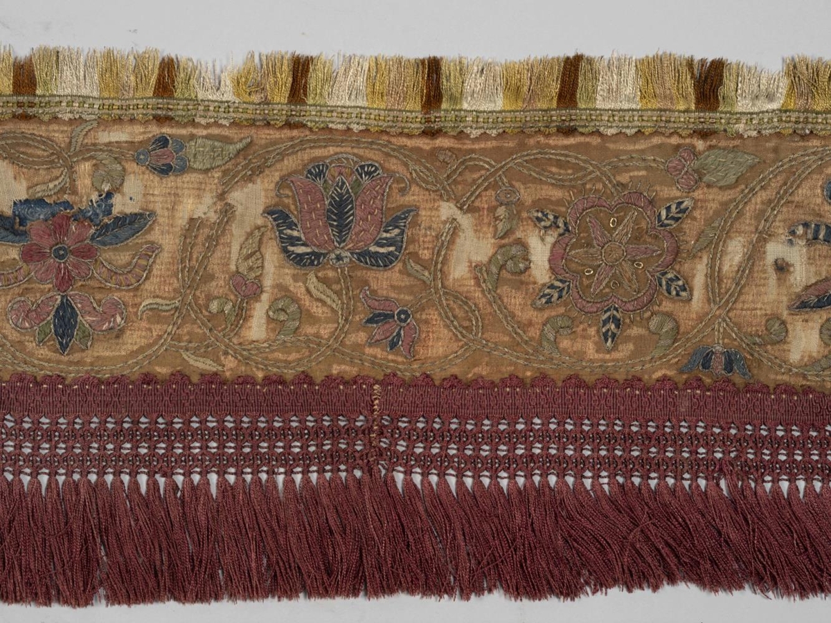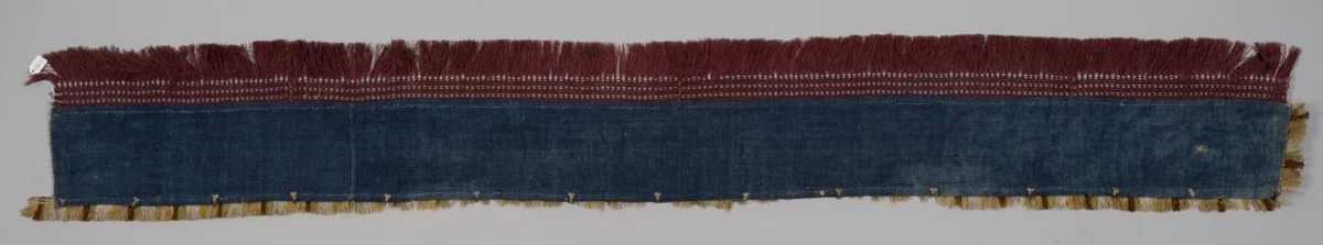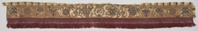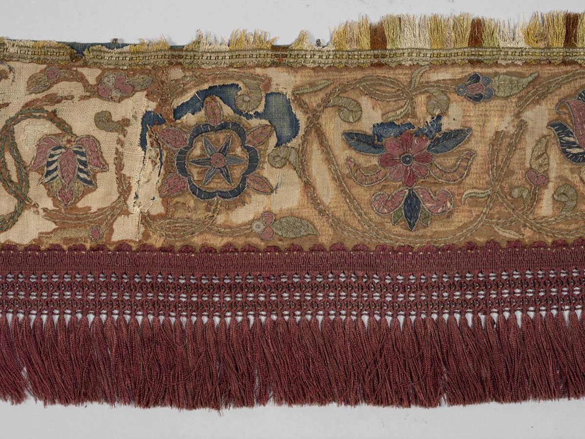 Gamalt altarisklæði úr Hólakirkju.* *og altarisbrún (ættu að vera 2 nr.), en jeg merki hana 4380a og klæðið 4380b. - Jeg fann þetta á skrifstofunni við rannsókn safnsins í júlí 1908. MÞ. - Sbr. Árb. '88-'92, bls. 95. Ad.4380 b. Sbr. Útekt Hólastaðar 1692: Altaris klæði ---- fiörður grænt af raste með äsettum Rörumm mindumm og letrj að ofan verðu, fodrið og vel um vandat, ä sett alltaris Brün. Sbr. og ,,fiorda grænt" í útektunum 1628,'57 og '85. Altarisbrúnin sem nú fylgir (4380a) mun sú er úttektin 1712 getur svo: ,,Alltaris Brún af Rauðu Silke, bordýraða með silke og ekta gull og silfur vír, hefur Hústruen Þrúður (þ.e. Þrúður Þorsteinsdóttir, kona Björns bp. Þorleifssonar) tillagt. (Sbr. fangam. á brúninni). 1/6 1910. MÞ.
