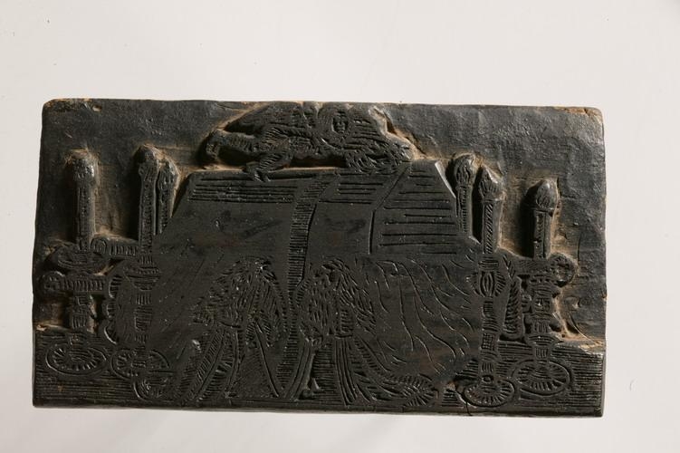 skorin í tré, til endanna standa sex ljósastikur og yfir lokinu er engill,
