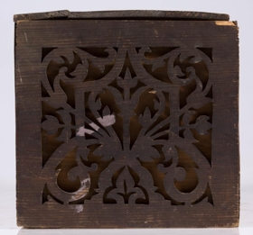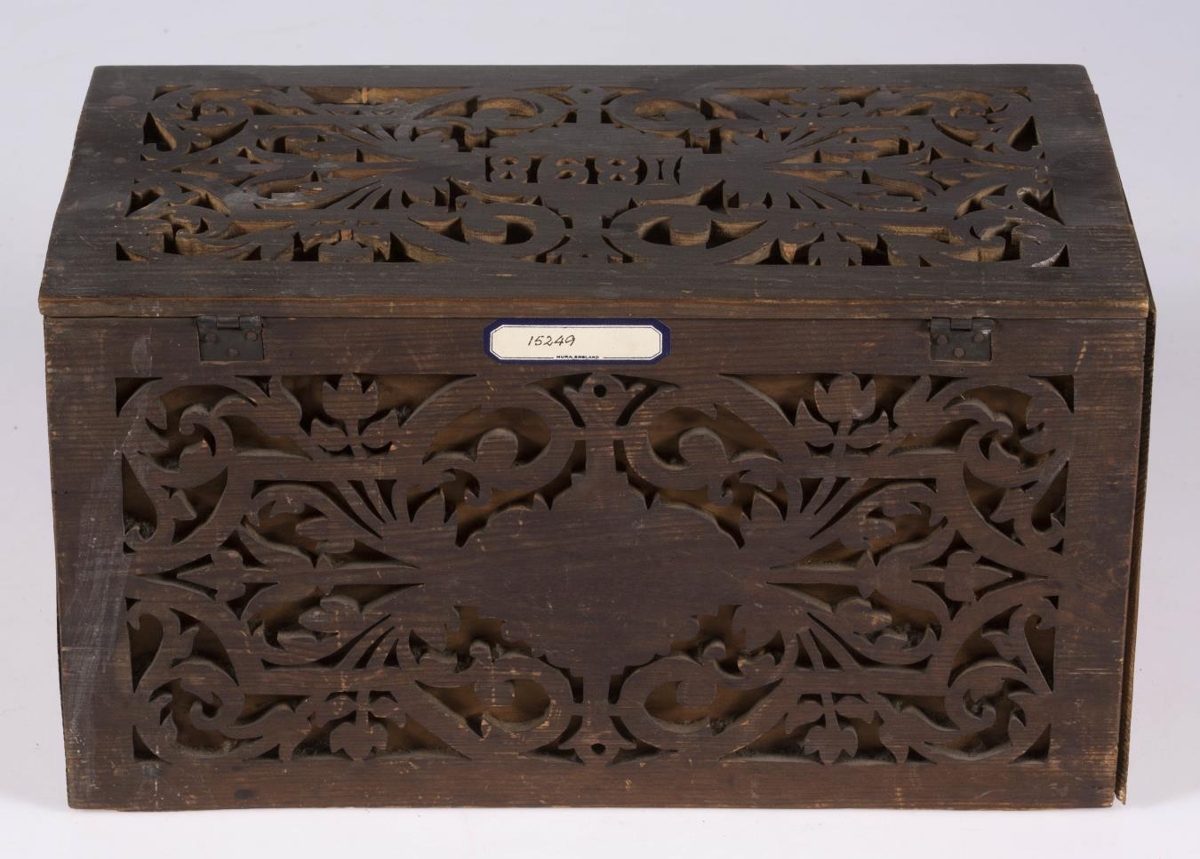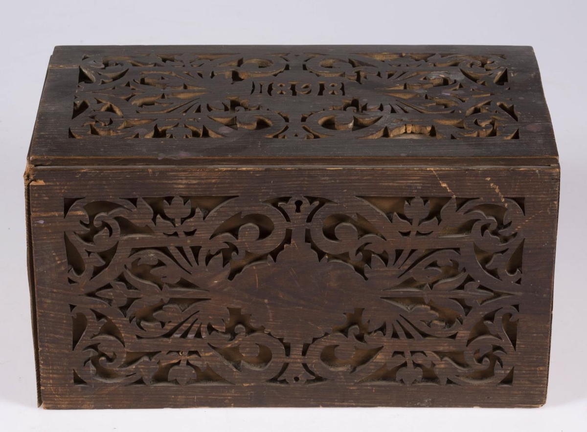 Kistill, lítill, með venjulegu lagi, hefur lok á hjörum. Smíðaður úr furu. Lengd 31 sm, hæð 16.5 sm, br. 17.5 sm. Til skrauts eru hafðar utan á hliðum og loki þunnar tréplötur, með gagnskornu verki, það sagað út. Plöturnar eru málaðar dökkbrúnar, lítið eitt rauðleitar, en kistillinn ómálaður undir. Skrautið er stílfært blómamunstur, samhverft alls staðar, og á lokinu er auk þess ártal: 1898. Innan á því er útskurður: rist blaðskraut og áletrun. Er áletrunin með höfðaletri, nema tvö tengiorð, hér skrifuð upp með venjulegri skrifstafagerð, eru þau með latínuletri á kistlinum: til FRÚ T.Þ.HÓLM frá S.J. Mun S.J. vera upphafsstafir í nafni Sigríðar Jónsdóttur frá Kinnarstöðum, sem smíðaði kistilinn. Skrá vantar, gegnskorna fjölin er dottin af vinstra gafli, en að öðru leyti er kistill þessi óskemmdur.
