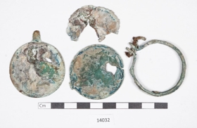 Kinga, fornleg, úr bronsi, hún er kringlótt, með lykkju upp úr til að festa við snúru og hengja um hálsinn: í lykkjunni eru leyfar af slíkri snúru og virðist hún hafa verið úr skinni. Kingan er 4,1 að þverm. og um 1 cm að þ.: er hún smíðuð þannig að plötur eru kveiktar báðum megin á hring. Þar ofan á hafa svo verið kveiktar aðrar plötur eða þynnur með ágröfnu skrauti og fornlegum höfðaletursstöfum. Kveikingarnar eru nú allar bilaðar, svo að plöturnar eru lausar við og ágröfnu þynnurnar líka að mestu: á annarri plötunni er dálítið gat með bogadregnum hliðum, verður ekki betur séð en það sé upprunalegt: hinar ágröfnu þynnur eru mjög brotnar og illa farnar af spanskgrænu, letrið á þeim verður því ekki lesið, þó virðist vera IHS á annarri: ekki er heldur hægt að segja neitt með vissu um aldur en hún er mjög lík öðrum, sem til eru í safninu og hafa verið til að varðveita í helga dóma í kaþólskum sið. - Hún er fundin í jörð á Lagarholti.