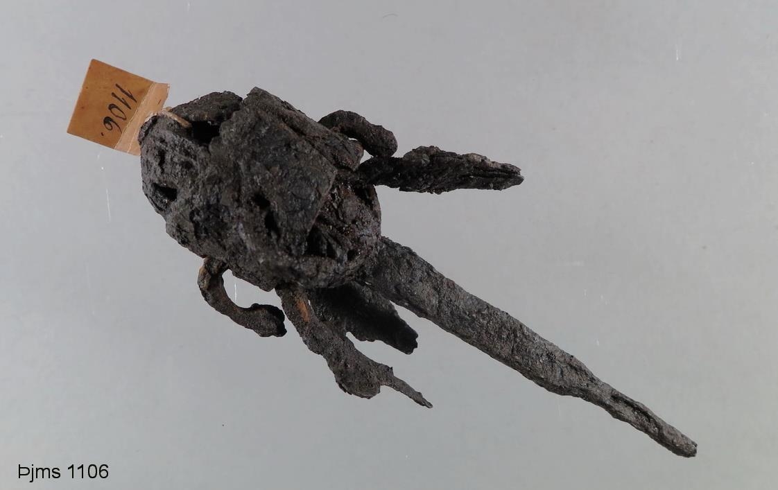 Hringla úr járni, þannig að efst er hetta með gagnskornu verki, neðst á henni kringlóttur hólkur, þverm. 3,6 cm., í honum 5 göt, sem smáspaðar ganga í: vantar nú 2 þeirra: þeir leika lausir og valda hljóði er þetta er hrist. Niður frá hólknum eru apturbeygjur 5 með bili á milli, allar samfastar í miðju eða neðst og myndast þannig nær hnöttóttur haus. Á honum miðjum og niður frá honum er járnteinn, ferstrendur að mestu leyti og 1 cm. að þverm., en neðst er hann mjög mjór 3-5 mm. að þverm. Alls er lengdin 14,5 cm. - Sbr. nr. 1802 og 2044 (líkust), nr. 5115, með ró á neðri enda teinsins, og svo mun og hafa verið á þessu (nr. 1106): ennfr. nr. 2938, sem er stærra. Auk þessara heillegu hluta hafa fundist nokkrar hettur og kragar, sem vantar á þetta nr. (1106): hafa farið af, og hefur í hinum eldri skýrslum verið getið um þessi: nr. 229,437,947-49 og 1044. Síðan hafa komið tvær líkar hettur af tini,nr. 1807 og nr. 2627, og af járni þessi nr: 3043,3256-58, 3479, 3592-93 og 5984. Öll þessi nr. virðast hafa tilheyrt samskonar áhaldi. Þau hafa fundist hingað og þangað úti við, sem fjarri manna bygðum. Helzt virðist útlent smíði á þessu og virðist smíðið bera hin gotnesku stólseinkenni: munu hlutir þessir vera frá 14-15. öld. Ekki sjást þeir á helztu söfnum á Norðurlöndum: kunna að hafa komið hingað frá Englandi eða Þýzkalandi (Hamborg). Óvíst er til hvers þessi áhöld hafa verið, en mjer þykir líklegt að þau hafi verið á hyfrum (aktygjubogum), mjói endinn neðst staðið í gegnum hyfrið mitt og róin að neðan, teinninn staðið beint upp frá hyfrinu og spaðarnir eða laufin leikið laus og glamrað er ekið var. Á sumum norskum hyfrum eru einskonar smáhringlur úr járni, settar jafnframt til skrauts 1) -Aktygi kunna að hafa verið notuð hjer á landi fyrrum við sleða-akstur. -Fanst samsumars uppblasið í heiðarhól (brennuhól) fyrir vestan túnið á Keldum. 1) 1.d. í allmörgum í Norr. safninu í Stokkhólmi.