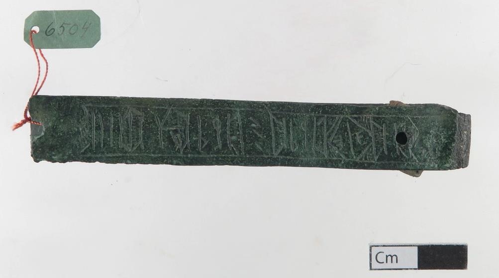 Svift úr eiri, samanbeygð þynna: hefir verið fest á leður með 2 nöglum og er sá við buginn eftir og leðurbútur þar á milli, en hinn hefir verið í gegnum endana og hefir brotnað af öðrum endanum um gatið. L. 9,2 cm., br. 1,3 cm. Utan á annars vegar er laglega grafið með fornum rómverskum upphafstöfum ILS | SON, endir föðurnafns eigandans og son. - Gljáandi spanskgrænuhúð er á sviftinni: fanst hún skamt frá Skógum í Fnjóskadal fyrir um 20 árum. Er frá miðöldum.