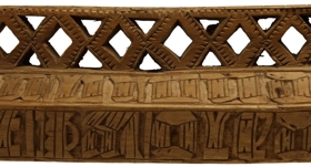 Höfðaletursáletranir á hliðum og á bríkum að ofanverðu er dróttkvæð vísa: