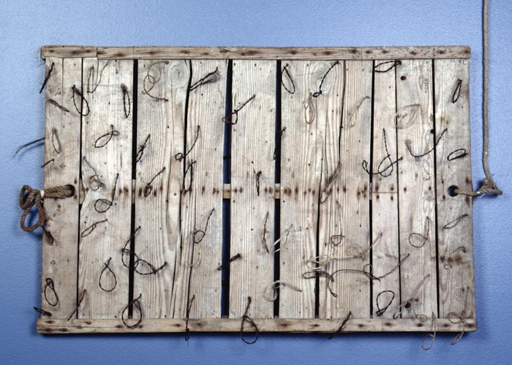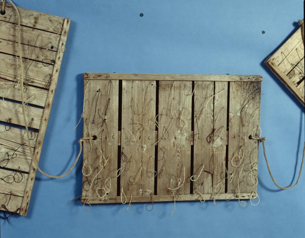 a. Lengd 95 sm, br. tæpir 63 sm. Átta þverfjalir, en ein þeirra í tvennu lagi og samskeytin við miðjuband. Er flekinn festur saman með litlum járnnöglum. Á yztu þverfjölunum er kringlótt gat í miðju. Bundið er í bæði, og er í öðru tvöföld lykkja, úr hinu liggur snúra, sem tengir fleka þennan við fleka b. Í eru 67 snörur.