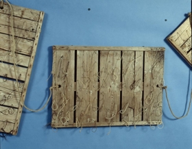 b. Lengd 91 sm, br. 63.5 sm. Fimm þverfjalir, festar við langbönd og brúnalista með trétöppum, einnig eru litlir járnnaglar til festingar. Gat á endafjölum í miðju, í þeim bönd, er tengja flekann við fleka a og c. Snörur eru 77.