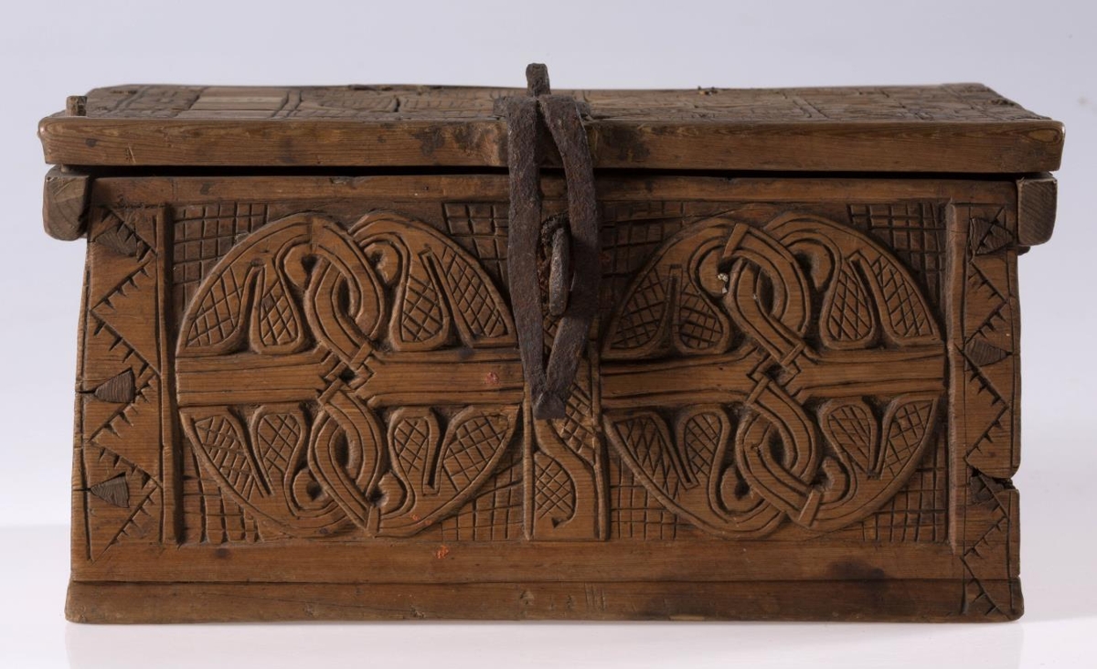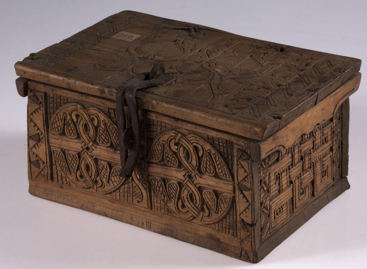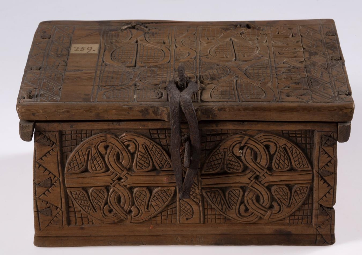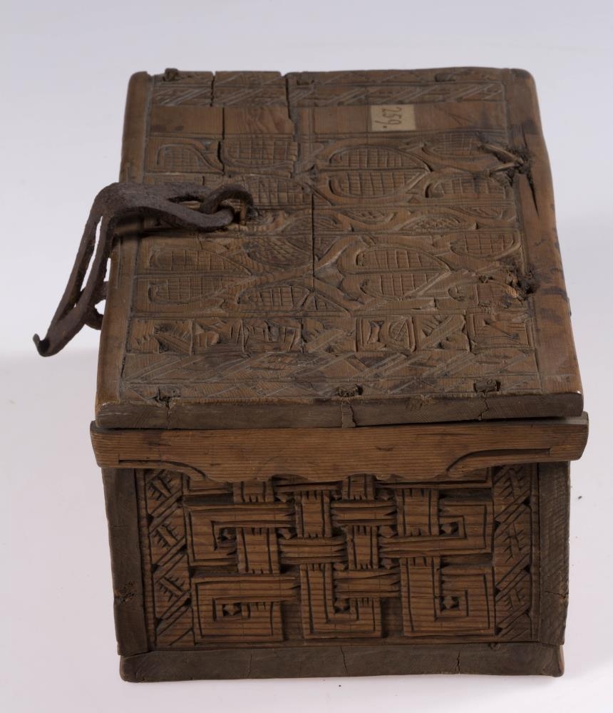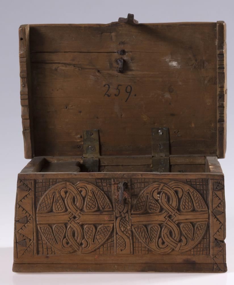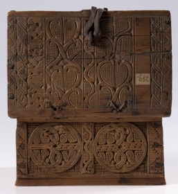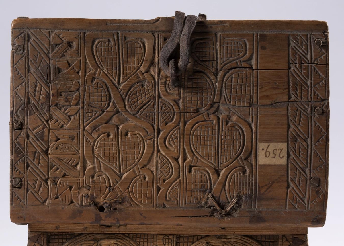 læsingu og hrosshárshjörum. Hann er skorinn með knútum og rósum, og einni