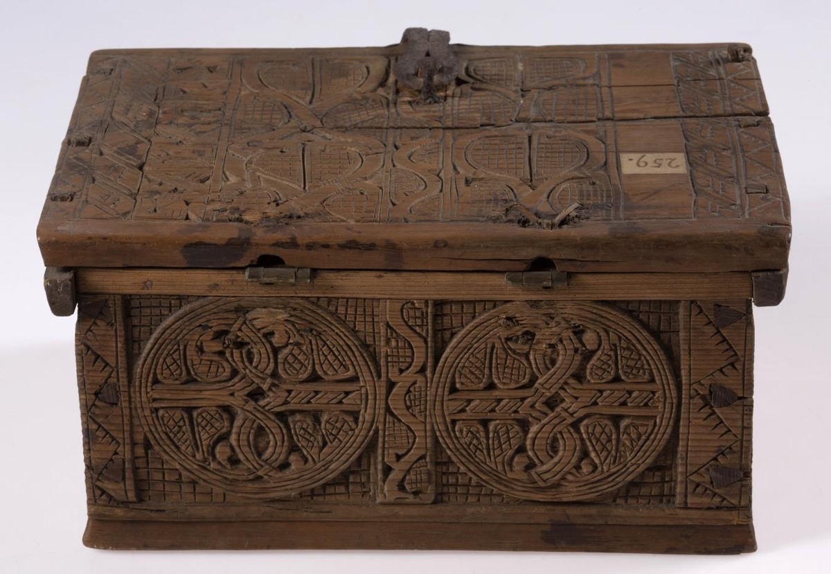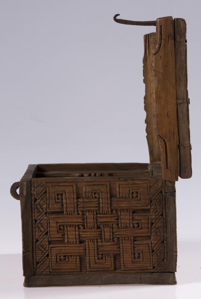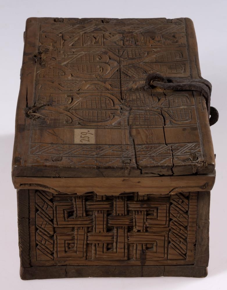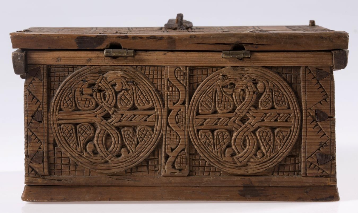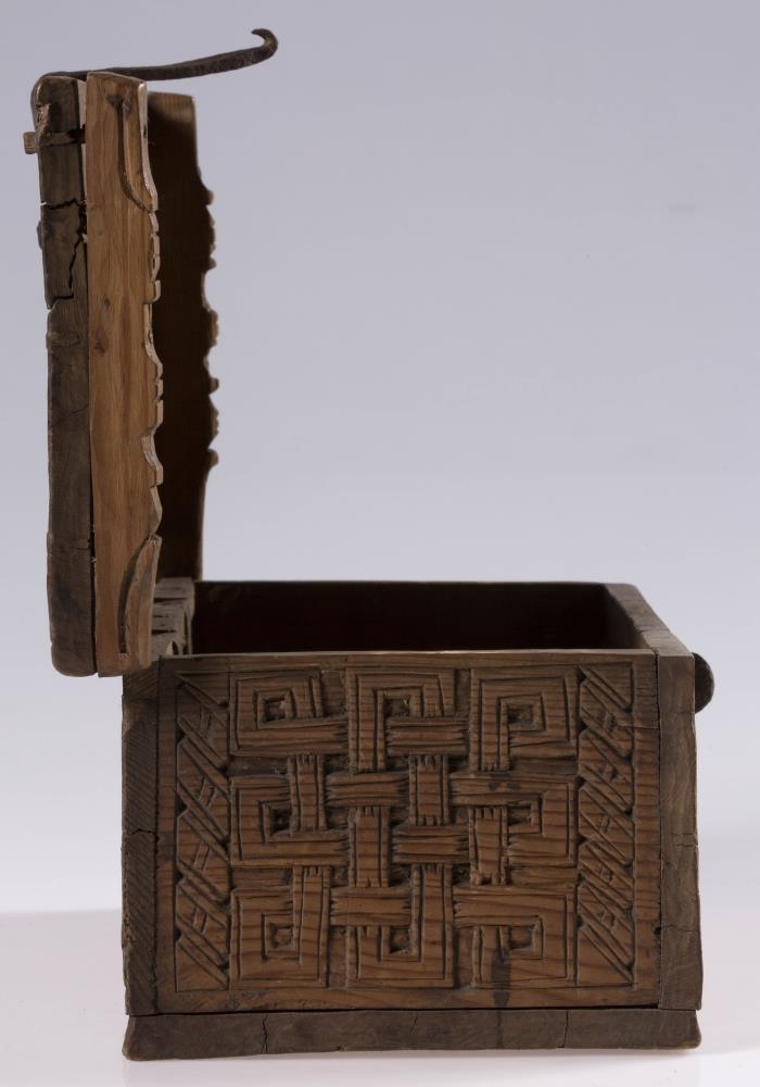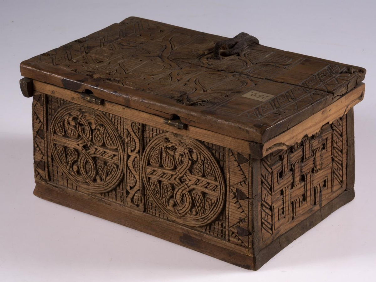 læsingu og hrosshárshjörum. Hann er skorinn með knútum og rósum, og einni