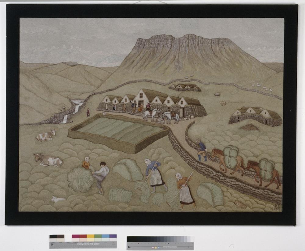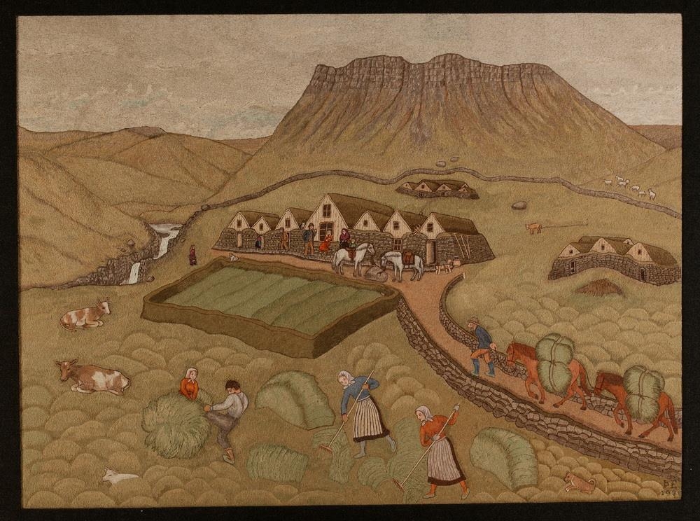 Útsaumuð mynd af ímynduðum íslenskum sveitabæ. Myndin er saumuð með listsaumi úr íslensku ullarbandi sem Þórdís Egilsdóttir vann sjálf. Hún kembdi, spann og litaði að mestu með jurtalitum. Fyrirmyndina teiknaði Ríkarður Jónsson myndskeri eftir hennar fyrirsögn. Á myndinni er burstabær sem stendur í hlíð og eru jafnframt útihús sjáanleg. Garður er frammi á hlaði en fólk er við heyvinnu á túninu fremst á myndinni.