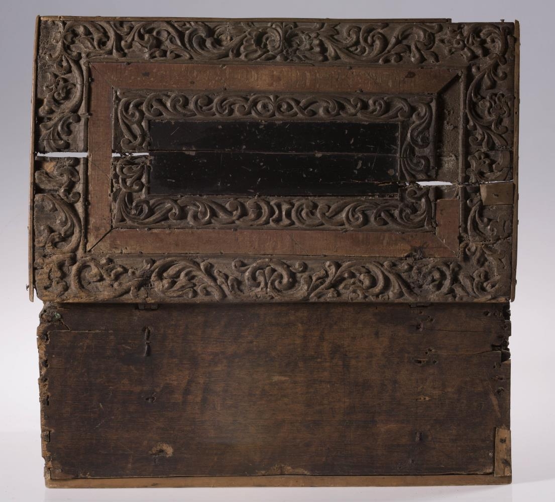á miðju loki er svart-lakkeruð: líkkega austurlenzk, fjöl, eða 2 samsettar,