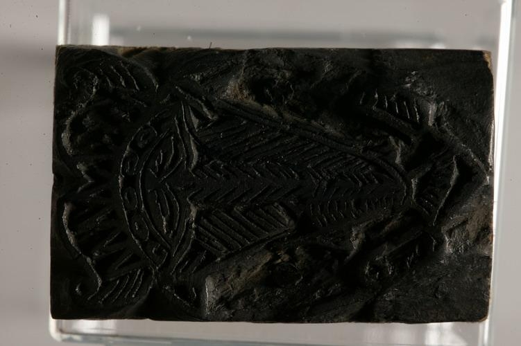 skorin í tré, með kórónu yfir: á Lassenii bænum, Hólum 1681, á Lögþingisbókum,