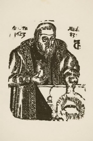 Mynd Guðbrands biskups Þorlákssonar, skorin í tré: hann er í kápu með loðnu fóðri og kraga, og hefir bók í hendi, á myndinni er og ártalið 1623 aetat(is) 83 og G. T. bundið saman.
