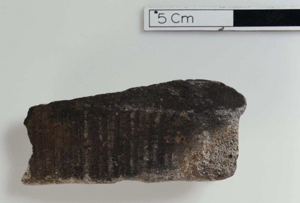 Grýtubrot úr tálgusteini, 13 cm langt, 6,3 cm breitt og 1-1,6 cm á þykkt. Grýtan virðist munu hafa verið sporöskjulöguð, með 4 cm háum, lóðréttum kanti og íhvolfum botni. Kanturinn er að utanverðu allur í lóðréttum gárum eftir áhaldið, sem grýtan hefur verið mótuð með, en vel slétt innan. Brotið er mjög sótugt utan. - Fannst á sama stað.
