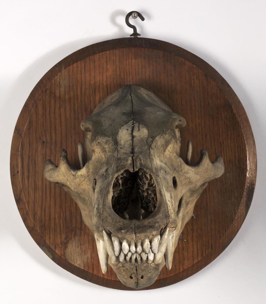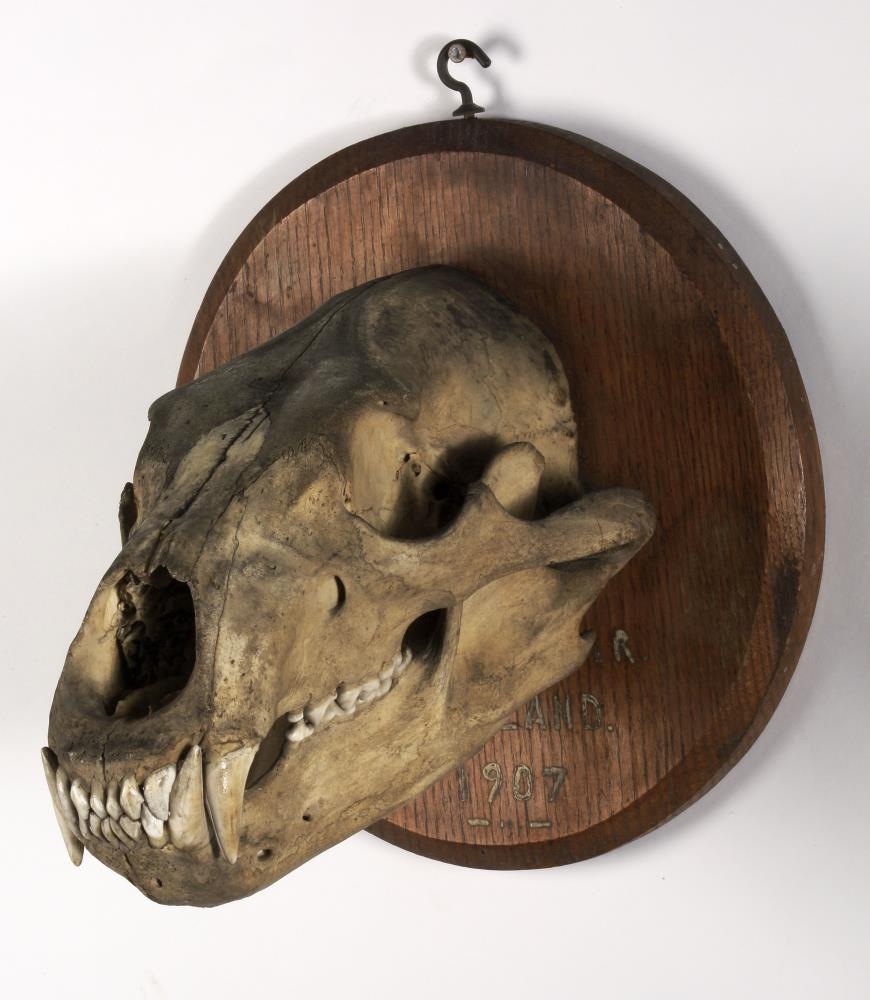 Hauskúpa úr ísbirni. Fest á viðarskjöld. Úr Wards-safni. Skráð þar 1950 sbr. bók og fengu þá allir munirnir nr. 1-374. Síðar voru þeir endurnúmeraðir og þá voru nokkrir þeirra (W 218-229) strikaðir út í skrá og þeim komið fyrir á Langahrygg, efst í Suðurgötuhúsinu. Síðar var ákveðið að færa þá muni inn og endurnúmera 1998. Þessi hlutur bar áður númerið W 221.