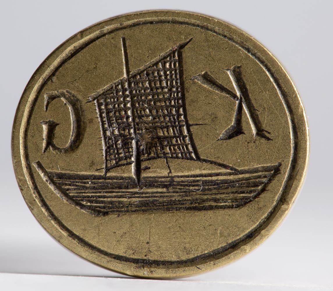 og er eilítið sporöskjulaga, 2 x 1,8 cm. Á henni er krotuð mynd af seglbát