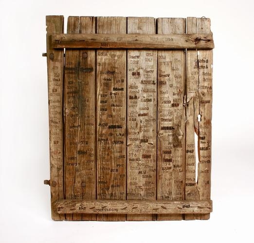 Smiðjuhurð, alsett brennimörkum sem smíðuð hafa verið í smiðjunni.