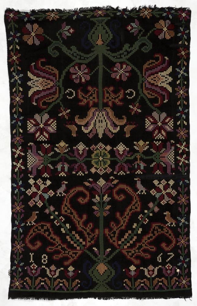 Söðuláklæði glitofið, l. 165 sm., br. 103,5 sm. Á báðum endum eru stórgerð blóm í blómkerum, en á milli er breiður blómbekkur. Umhverfis er og mjór blómbekkur. Á öðrum enda eru stafirnir G G, en hinu ártalið 1867. All mjög gallað orðið.