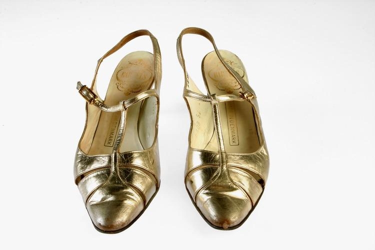Kvenskór, eitt par, úr gylltu leðri með mjórri tá, opnum hæl og hælbandi, ól er upp á rist og er spennt yfir rist. Danskir, frá Danish Design Bartels, eru í upphaflegum umbúðum og er sérstakur hlífðarpappír í kassanum, mun upphaflegur einnig. 2000-18-4 Spjaldtexti: Rokk og ról. Í kjölfar aukinna samskipta við aðrar þjóðir tók menningarlífið breytingum og hugtakið unglingamenning ruddi sér til rúms á sjötta áratugnum. Plötuspilarinn frá Philips er fyrir 45 snúninga plötur. Framleiðsla á Coca Cola hófst á Íslandi á styrjaldarárunum og neysla á sælgæti jókst hratt. Kodak-myndavélin er frá árinu 1964. Gylltu skórnir koma frá Grétu Håkansson flugfreyju. Rock ’n’ roll. Growing contact with the outside world led to changes in Icelandic life. “Teen culture” arrived in the 1950s. Philips gramophone for 45 rpm records. Production of Coca Cola commenced in Iceland during World War II, and consumption of sweets rose rapidly. Kodak camera from 1964. The gold shoes belonged to Greta Håkansson, airhostess.