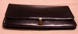 Svart samkvæmisveski án ólar. Slétt og látlaus með látúnslás. Fóðruð með taui.