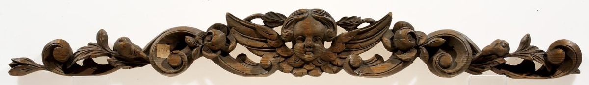 Fjöl, vel útskorin og gagnskorin í skábogastíl, engilhöfuð í miðju, með útbreiddum vængjum, og sín greinin út frá hvoru megin. Efnið fura, ómáluð. L. 79,5 cm: br. mest 9,5 cm. Sögð vera ofan af rúmslá.